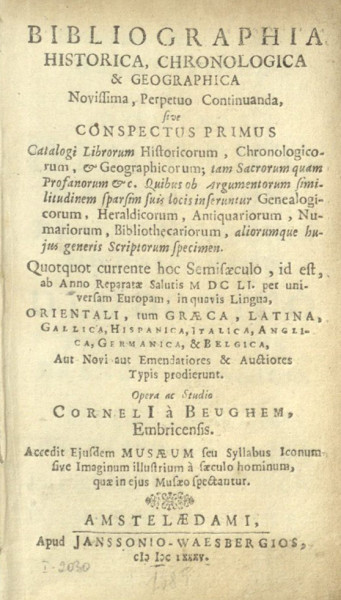 Bibliographia historica, chronologica et geographica… : accedit ejusdem Musaeum, seu Syllabus iconum sive imaginum illustrium a saeculo hominum, quae in ejus musaeo spectantur / Cornelius Beughem.- Amstelodamus : Johannes van Waesbergen Editor , 1685.