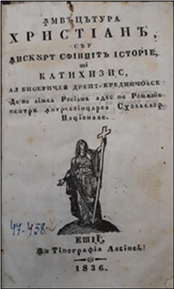 Învăţătura hristiană/ sau/ în scurt sfinţita istorie/ şi/ catihizis, al Bisericei drept‑credincioase/ de pe limba rosiană adus pe românie/ pentru întrebuinţarea shoalelor naţionale, Eşii, în Tipografia Albinei, 1836, 3 f., 87 pp. numerotate, 1 p. erată (nenumerotată) (Fig. 5)