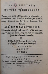 Tomul 4 (1827) (Fig. 7) conţine 267 pp. şi începe cu prezentarea istoriei britanicilor, a scoţienilor, irlandezilor, portughezilor; ni se oferă informaţii despre Neapole, Sicilia, Malta, Toscana, Veneţia, Mediolan (Milano), Genova, Corsica, Sardinia, Elveţia, Geneva, Boemia, Prusia, Ungaria, Polonia, Danemarca (numită Dania), Rusia, Turcia, ţările Asiei (Mongolia, China), Africa, America, Dachia, istoria avarilor, bulgarilor și sârbilor.