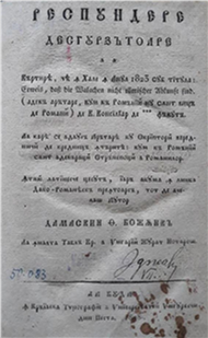 Respundere/ desgurzătoare/ la/ cârtirea cea în Hale în anul 1823 sub titula/ „Erweiss, dass die Walachen nicht Römischer Abkunft sind”/ (adecă arătare, cum că românii nu sunt viţă/ de romani) de K. Konsiliar de *** făcută/ la cară se adausă arătare cu scriptori verednici de credinţă întărită: cum că românii sânt adevăraţi strănepoţi a romanilor/ întâiu latinesce ţesută, iară acuma în linba daco‑romanească preîntoarsă, tot de acelaş autor/ Damaschin Th. Bojâncă/ la Înalta Tablă Cr(ăiască) a Ungarii jurat notaroş/ la Buda/ în Crăiasca Tipografie a Universitaţei ungureşti/ din Pesta/ 1828, I [f.], 120 pp. (Fig. 6)