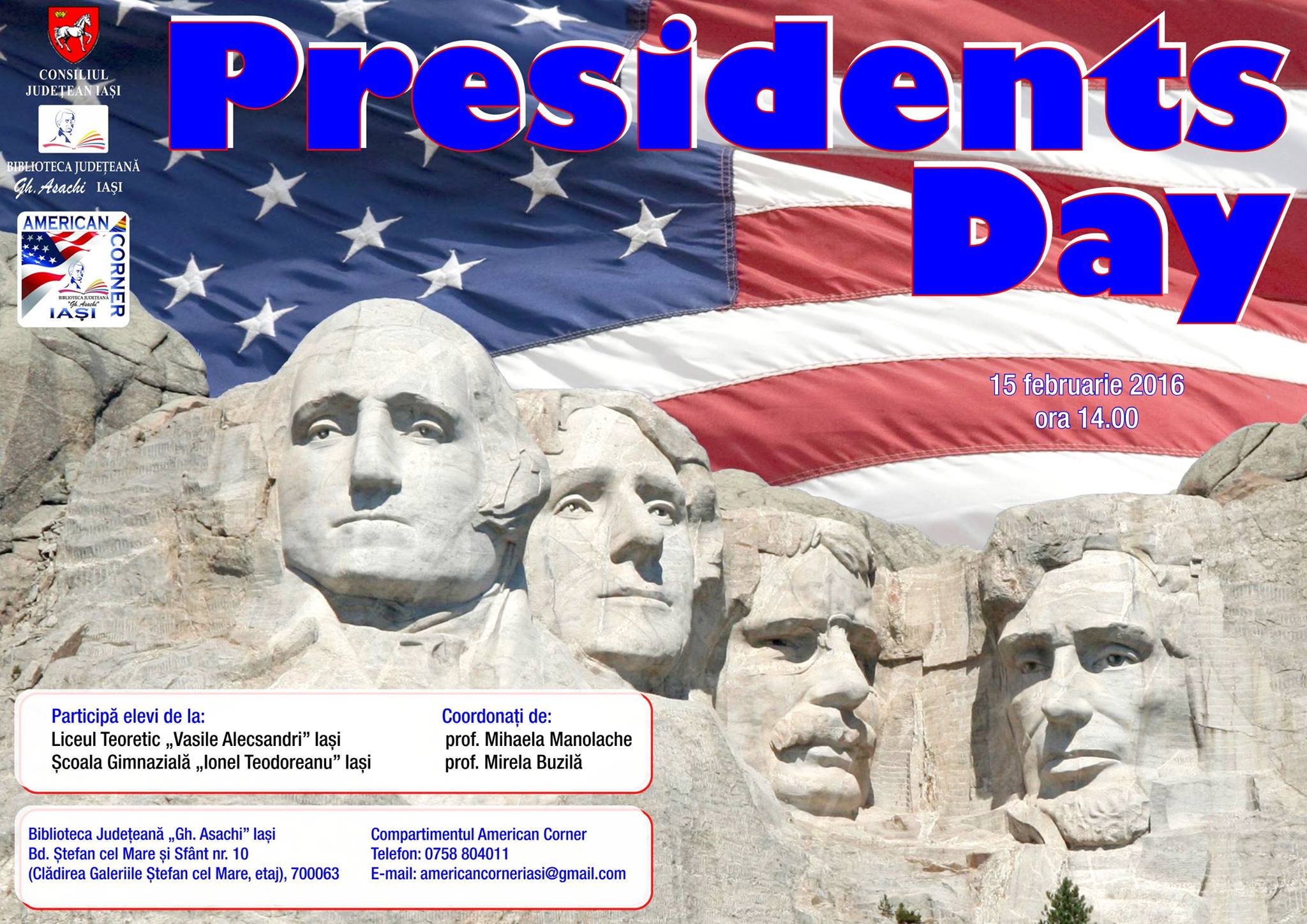 A treia zi de luni din februarie marchează în fiecare an una dintre sărbătorile naționale (fără dată fixă) ale SUA, President’s Day. Și noi am sărbătorit la Compartimentul American Corner, din cadrul Bibliotecii Județene „Gh. Asachi”, alături de elevi de clasele a VII-a și a VIII-a de la Liceul „V. Alecsandri” și Școala „Ionel Teodoreanu”, coordonați de prof. Mihaela Manolache și prof. Mirela Buzilă.
