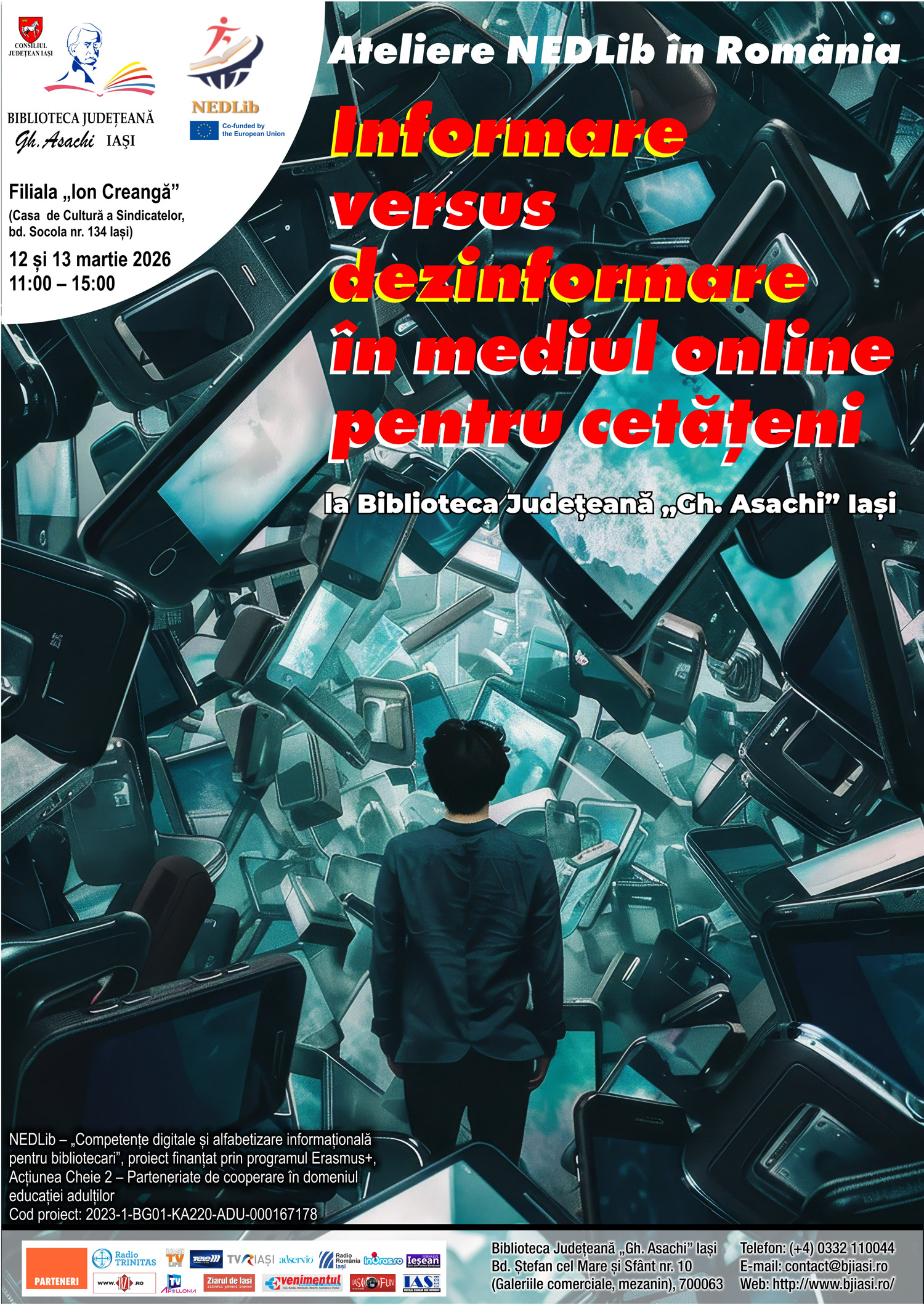 În zilele de 12 și 13 martie 2026, Biblioteca Județeană „Gh. Asachi” Iași organizează două ateliere de alfabetizare informațională și media în cadrul proiectului NEDLib – „Competențe digitale și alfabetizare informațională pentru bibliotecari”, proiect finanțat prin programul Erasmus+, Acțiunea Cheie 2 – Parteneriate de cooperare în domeniul educației adulților, Cod proiect: 2023-1-BG01-KA220-ADU-000167178.