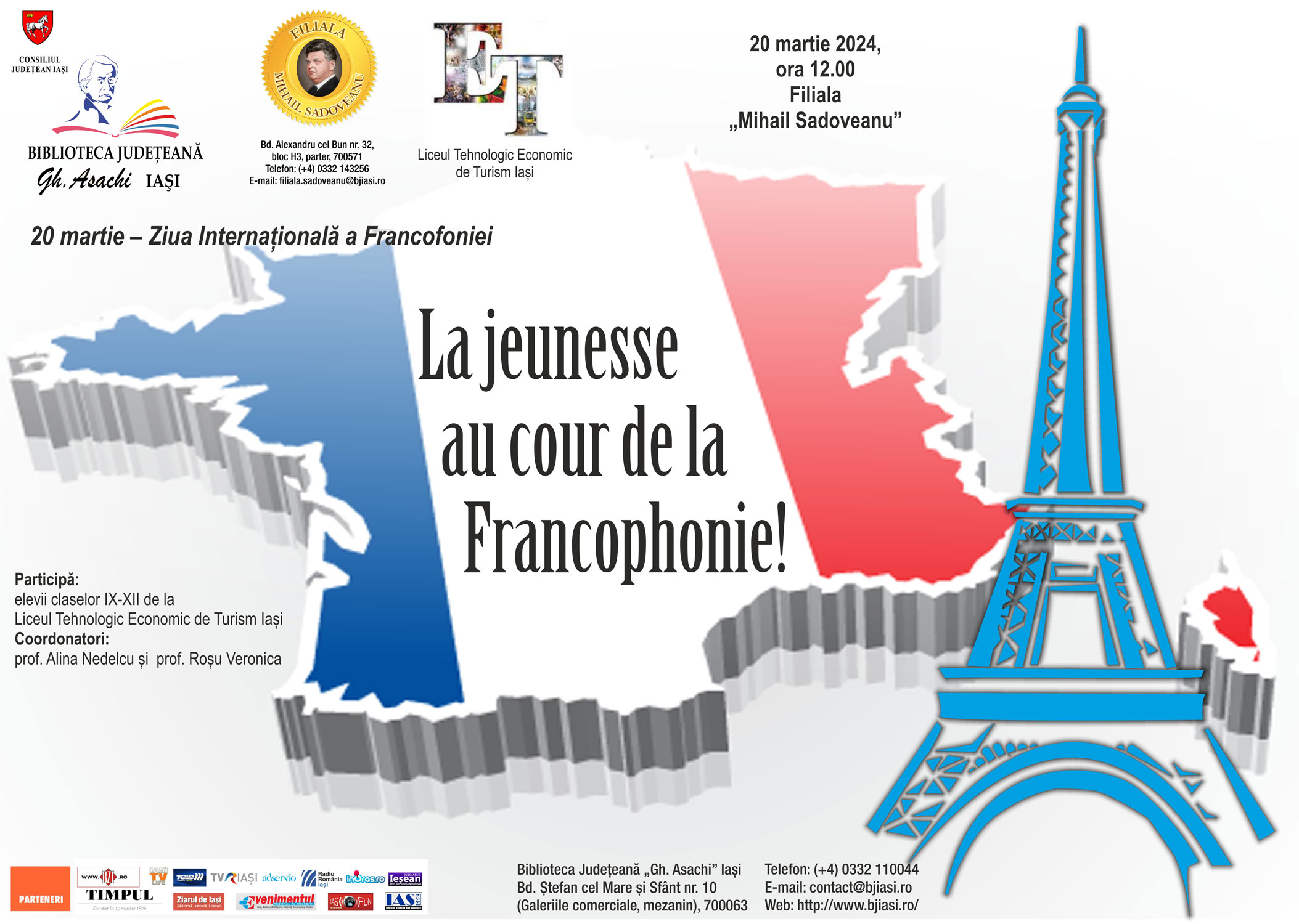 Francofonia este o prezență importantă în lume, cu o bogată diversitate culturală și lingvistică, care contribuie la dezvoltarea și promovarea valorilor comune și a cooperării internaționale, este importantă pentru relațiile economice și comerciale internaționale. Anual, pe 20 martie, de Ziua Internațională a Francofoniei, serbată pe cinci continente, de vorbitorii de limba franceză, au loc numeroase activități în școli, biblioteci, instituții de cultură, concursuri, spectacole, festivaluri de film, întâlniri literare, degustări de vin și preparate specifice sau expoziții de artă. Cu acest prilej, elevii claselor IX-XII, de la Liceul Tehnologic Economic de Turism Iași, coordonați de doamnele profesoare Alina Nedelcu și Roșu Veronica, sunt așteptați la Filiala „Mihail Sadoveanu”, la ora 12.00, la activitatea La jeunesse au cour de la Francophonie! Liceenii vor proba nivelul cunoștințelor lor despre cultura și civilizația franceză, vor prezenta în sistem power-point diverse materiale despre francofonie, vor susține un mini-dialog în limba franceză.