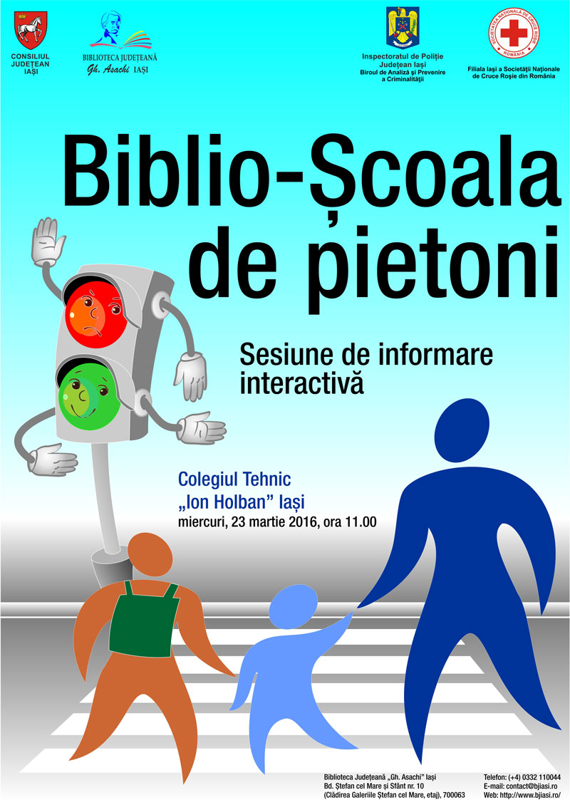 Miercuri, 23 martie 2016 ora 11,00 vom face o nouă oprire la Colegiul Tehnic „Ion Holban” Iași unde vom derula sesiunile de infomare din cadrul proiectului Biblio-Școala de Pietoni. Ne vom întâlni cu elevii claselor V-VIII care vor face cunoștință cu un set de informații vitale pentru viața și siguranța lor rutieră și vor vedea concret care sunt pașii pentru a știi cum să salvezi și să prețuiești viața.