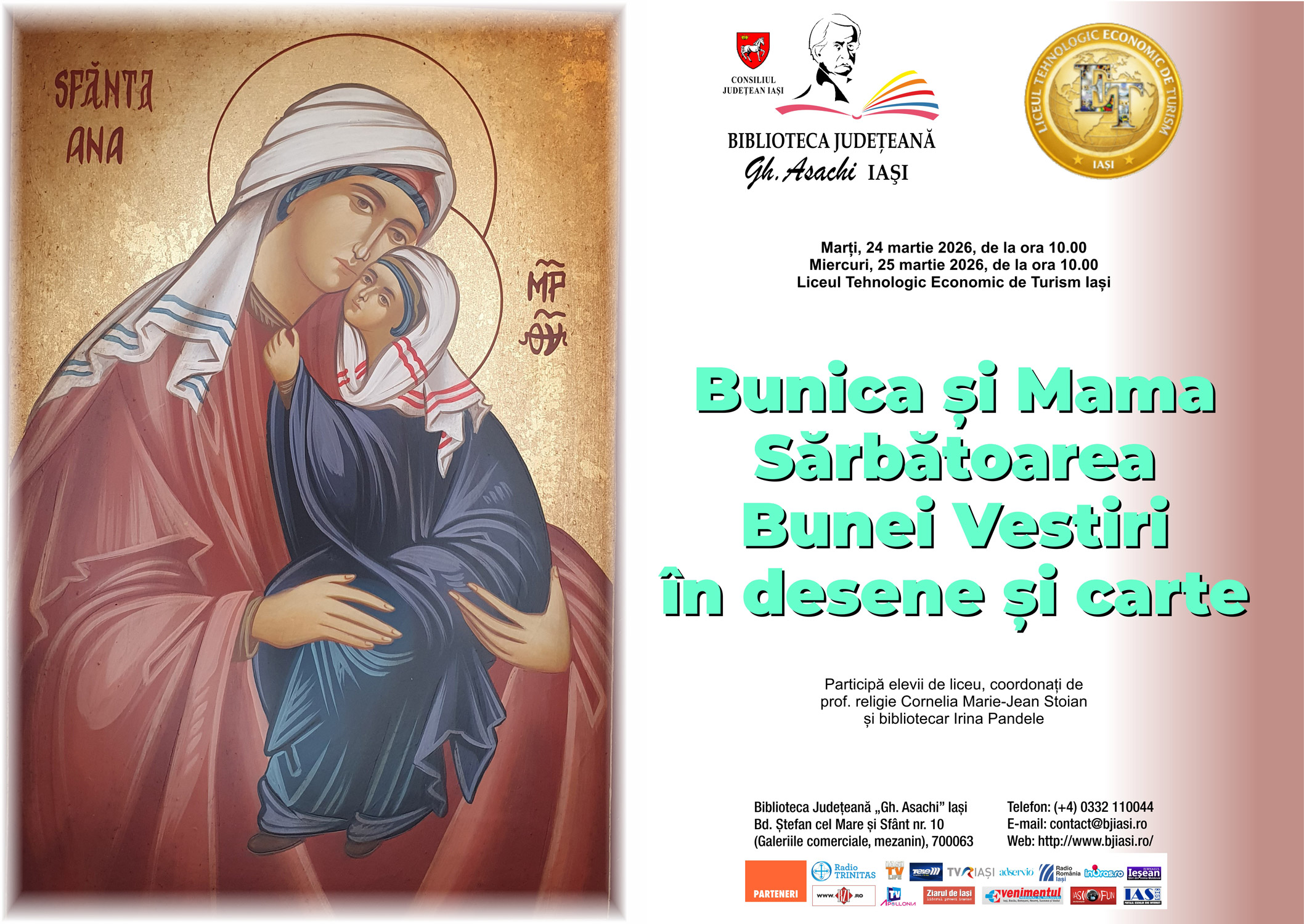 Marți, 24 martie 2026, de la ora 10.00 și miercuri, 25 martie 2026, de la ora 10.00, Biblioteca Județeană „Gh. Asachi” Iași alături de Liceul Tehnologic Economic de Turism Iași, va desfășura două noi activități, dedicate rolului femeii în familie, în luna martie și mai ales cu ocazia Sărbătorii Bunei Vestiri în desene și carte – sărbătoarea femeii creștine – Bunica și Mama.