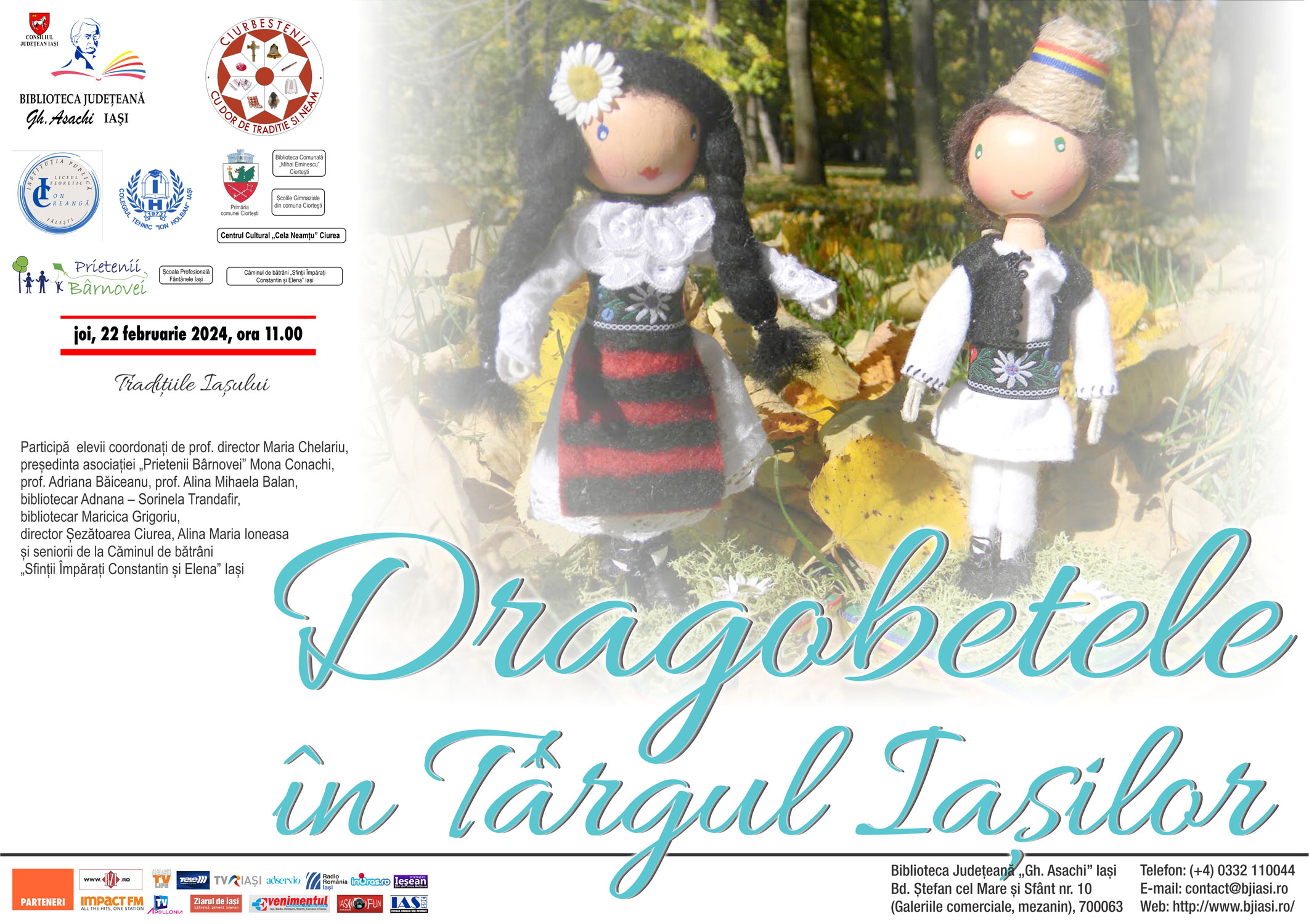 Joi, 22 februarie 2024, de la ora 11.00, Biblioteca Judeţeană „Gh. Asachi” Iași în parteneriat cu Asociația „Ciurbeștenii”, Liceul Teoretic „Ion Creangă” Fălești, Republica Moldova, Colegiul Tehnic „Ion Holban” Iași, Asociația „Prietenii Bârnovei” Iași, Primăria Ciortești, Biblioteca comunală „Mihai Eminescu” Ciortești, Școlile Gimnaziale ale Comunei, Școala Profesională Fântânele Iași, Centrul Cultural „Cela Neamțu” Ciurea, Căminul de bătrâni „Sfinții Împărați Constantin și Elena” Iași organizează întâlnirea „Dragobetele în Târgul Iașilor” – Tradițiile Iașului.
