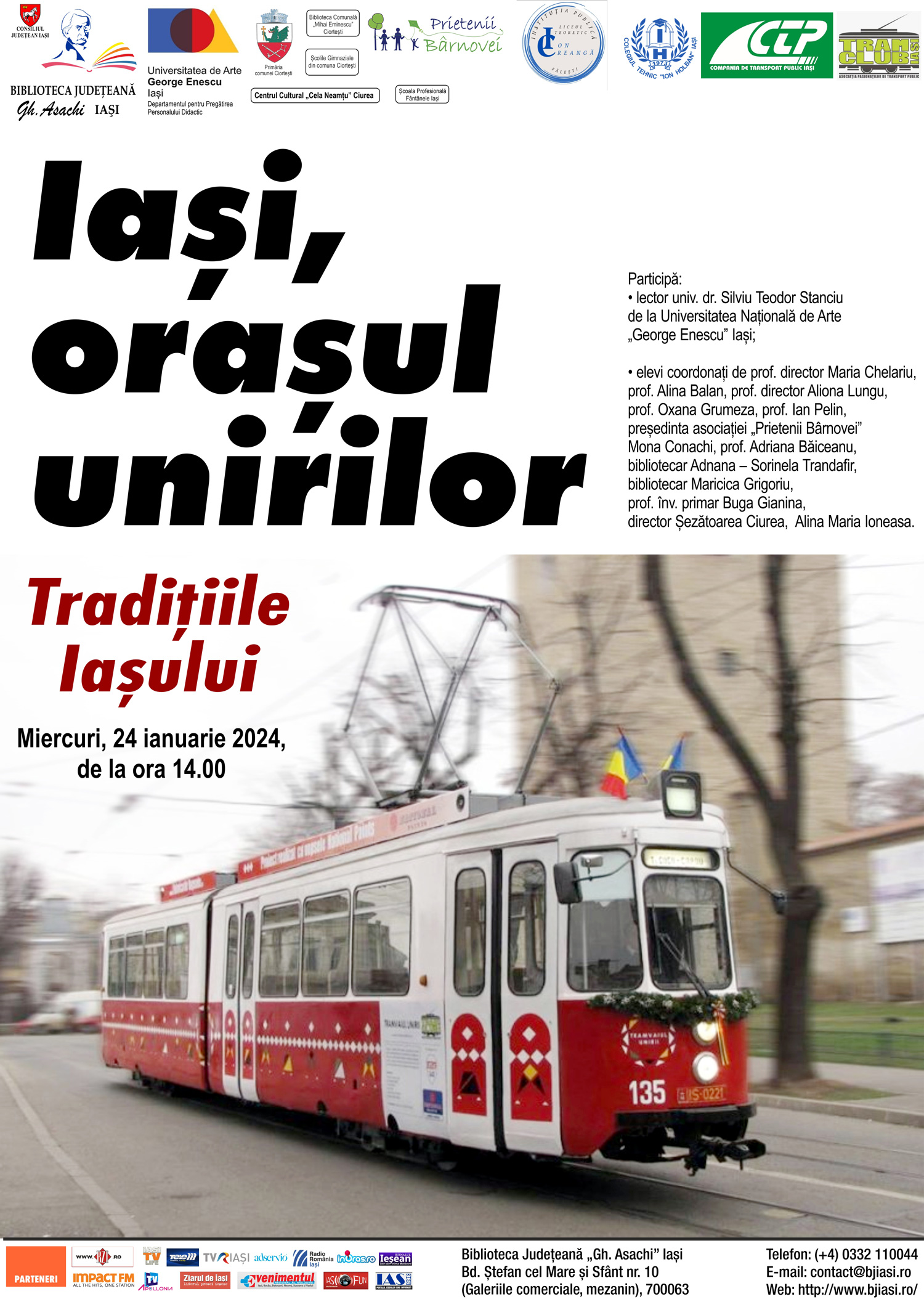 Miercuri, 24 ianuarie 2024, de la ora 14.00 Biblioteca Judeţeană „Gh. Asachi” Iași în parteneriat cu Universitatea de Arte „George Enescu” Iași, Asociația „Tramclub Iași”, CTP Iași, Liceul Teoretic „Ion Creangă” Fălești, Republica Moldova, Colegiul Tehnic „Ion Holban” Iași, Asociația „Prietenii Bârnovei” Iași, Primăria Ciortești, Biblioteca comunală „Mihai Eminescu” Ciortești, Școlile Gimnaziale ale Comunei, Școala Profesională Fântânele Iași, Centrul Cultural „Cela Neamțu” Ciurea, organizează întâlnirea „Iași, orașul unirilor” – Tradițiile Iașului.