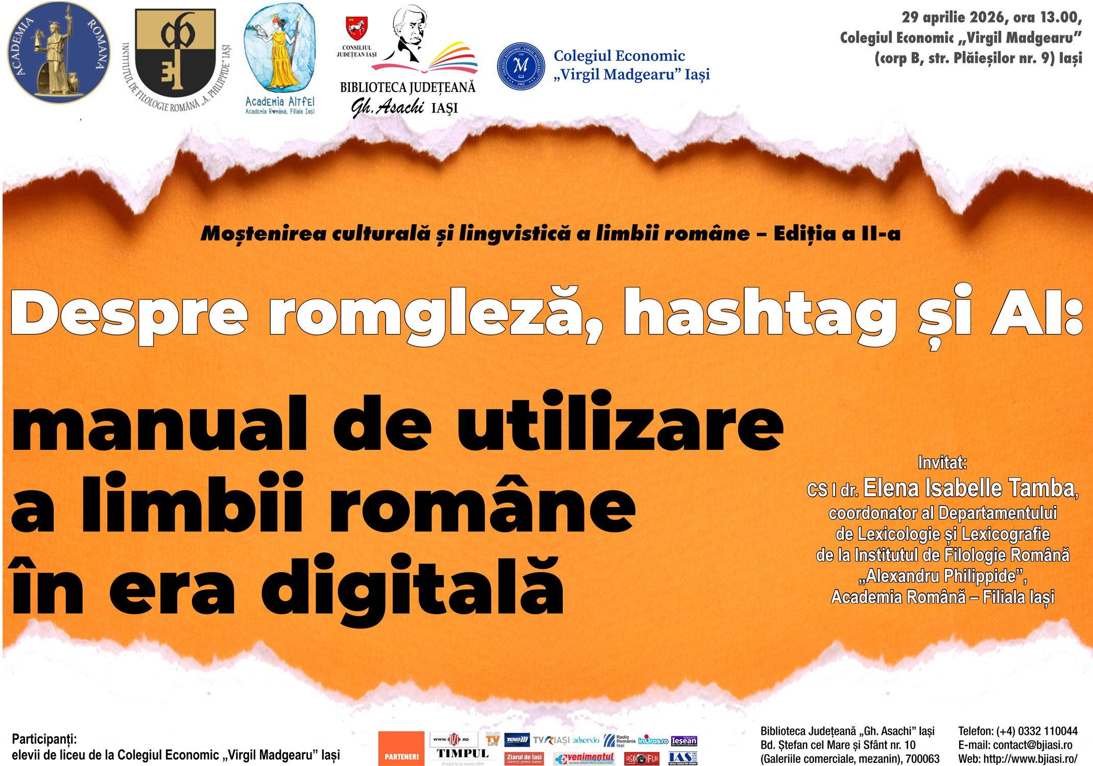 În 29 aprilie 2026, ora 13.00, Biblioteca Judeţeană „Gh. Asachi” din Iași în parteneriat cu Institutul de Filologie Română „Alexandru Philippide” – Academia Română, Filiala Iași organizează o întâlnire la care vor fi prezenți elevii de liceu de la Colegiul Economic „Virgil Madgearu” (corp B, str. Plăieșilor nr. 9) Iași.