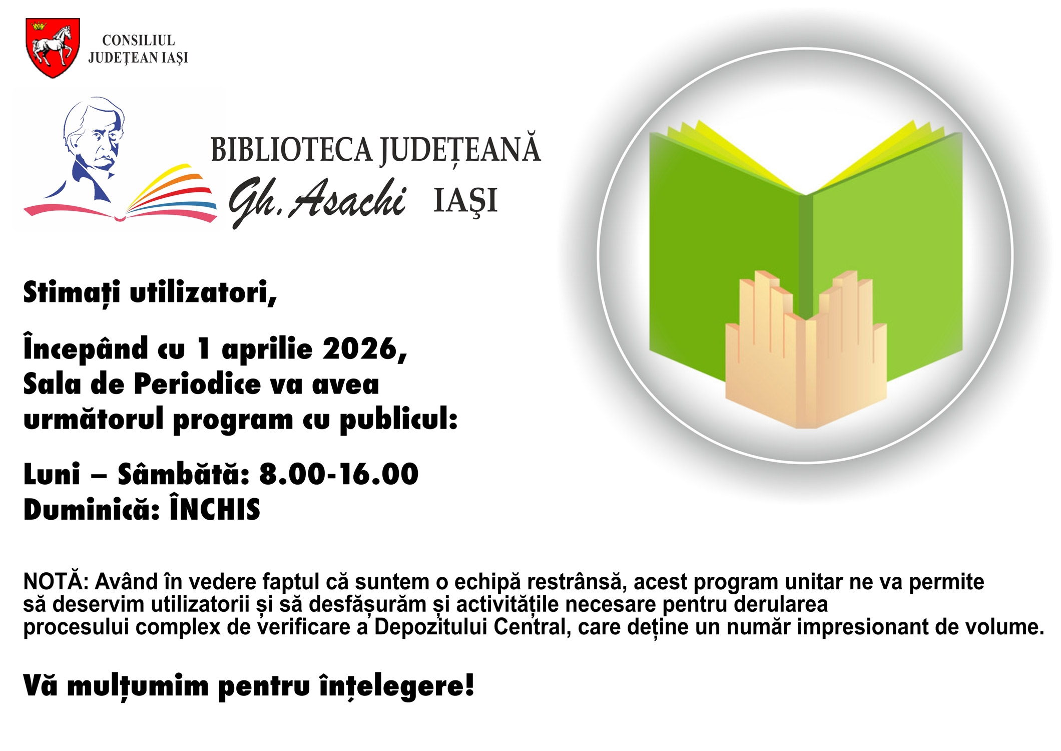 Începând cu 1 aprilie 2026, Sala de Periodice va avea următorul program cu publicul: