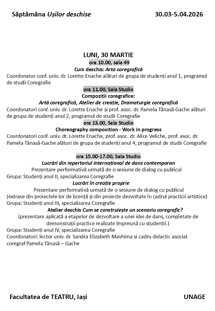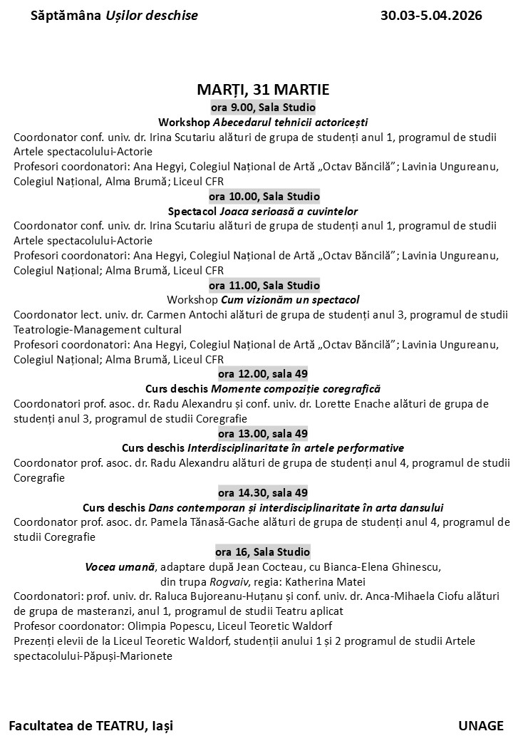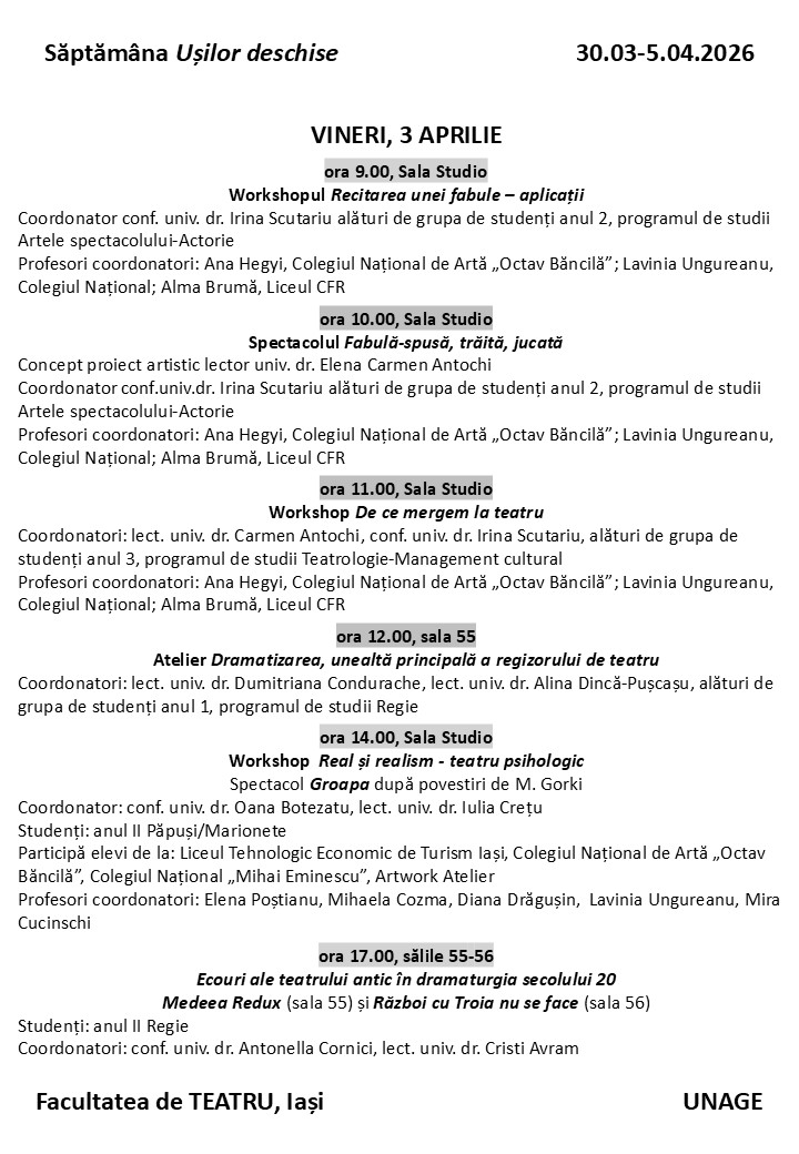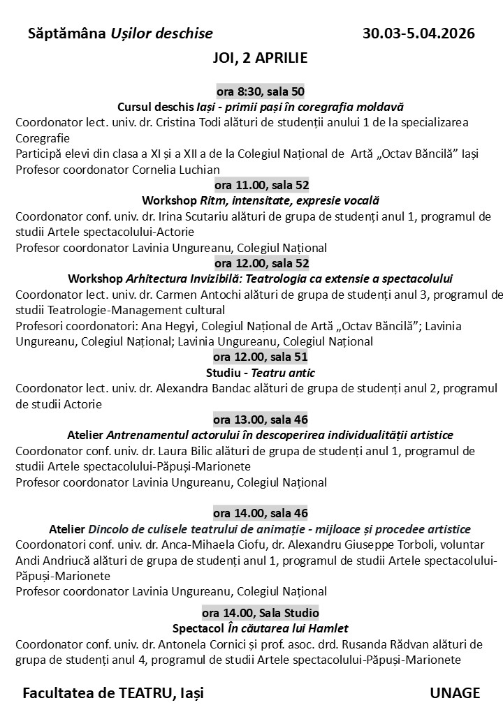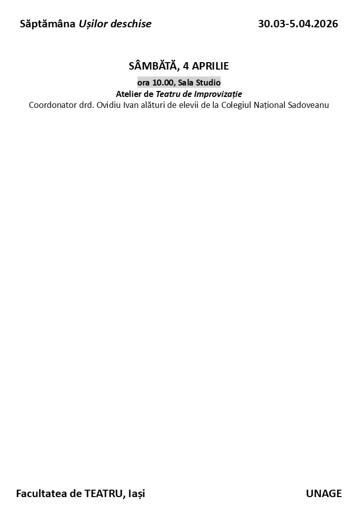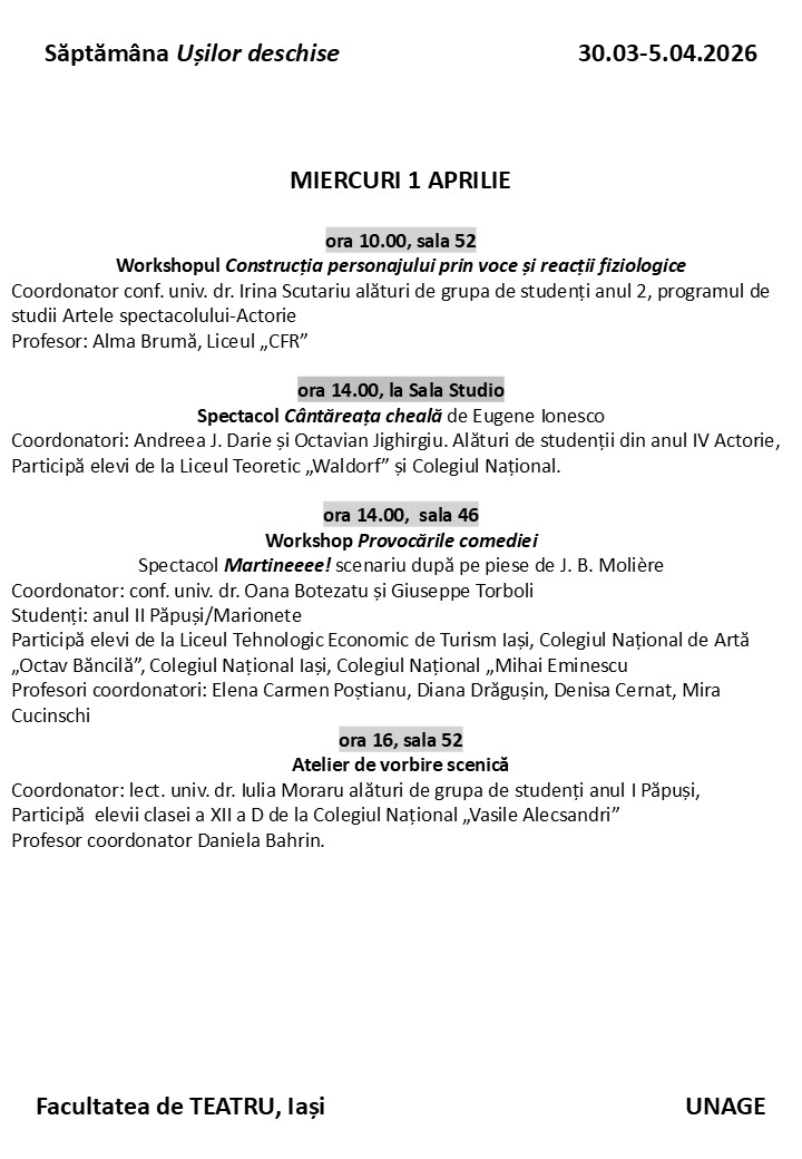 Facultatea de Teatru din cadrul Universității Naționale de Arte „George Enescu” din Iași are plăcerea de a vă aduce în atenție un eveniment dedicat viitoarei generații de artiști : „Săptămâna Ușilor Deschise”.