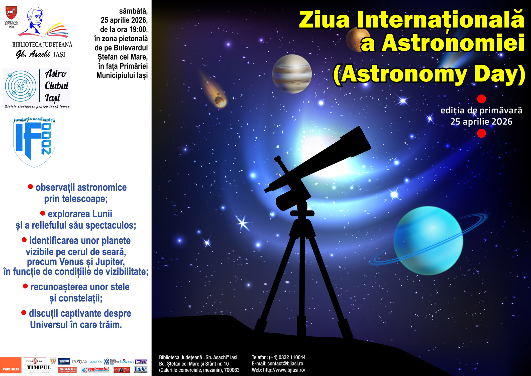 Vă invităm să vă alăturați Bibliotecii Județene „Gh. Asachi” Iași, AstroClubului Iași și Fundației „Idei și Fapte pentru anii 2000”, în seara zilei de 25 aprilie 2026, de la ora 19:00, în zona pietonală de pe Bulevardul Ștefan cel Mare, în fața Primăriei Municipiului Iași, pentru a celebra împreună Ziua Internațională a Astronomiei 2026 la Iași.